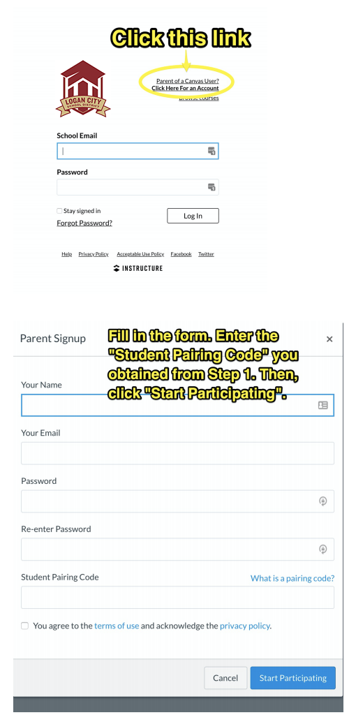 To obtain the pairing code, simply have each of your students login to their own Canvas account. They can do so by going Clicking HERE to login to Canvas and logging in with their student Gmail credentials (i.e. S12345@loganschools.org, and their assigned password.) If they don’t know or remember their email address and password, please contact the child’s school.