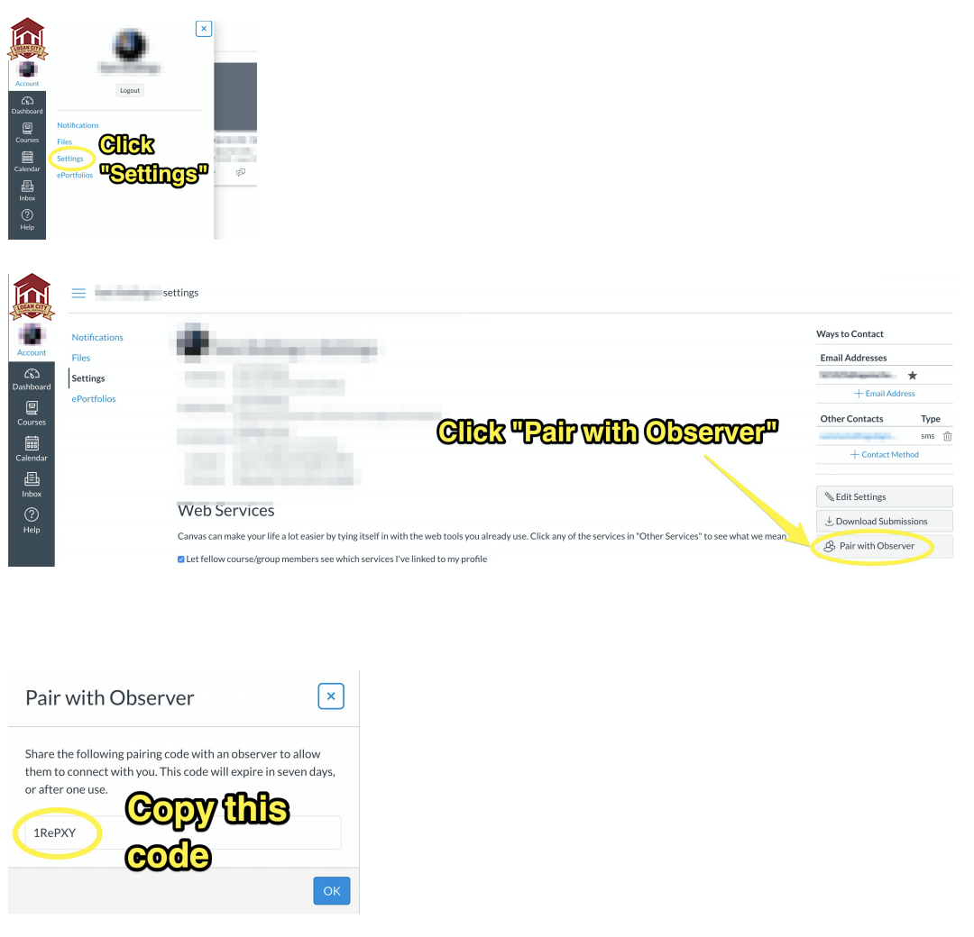 The first step is to obtain a “pairing code” from each child’s Canvas account. This pairing code will link you to your child in Canvas, so that you can see all of their courses and information.